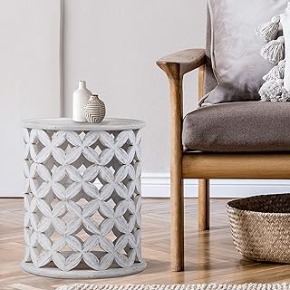 WOMO-DESIGN Table Basse Orientale Bergamo Ø45x55 cm Rond Blanc en Bois de Manguier Massif Sculpté à la Main Table d'Appoint Style Vintage Design Indien Bout de Canapé de Salon Table de Chevet